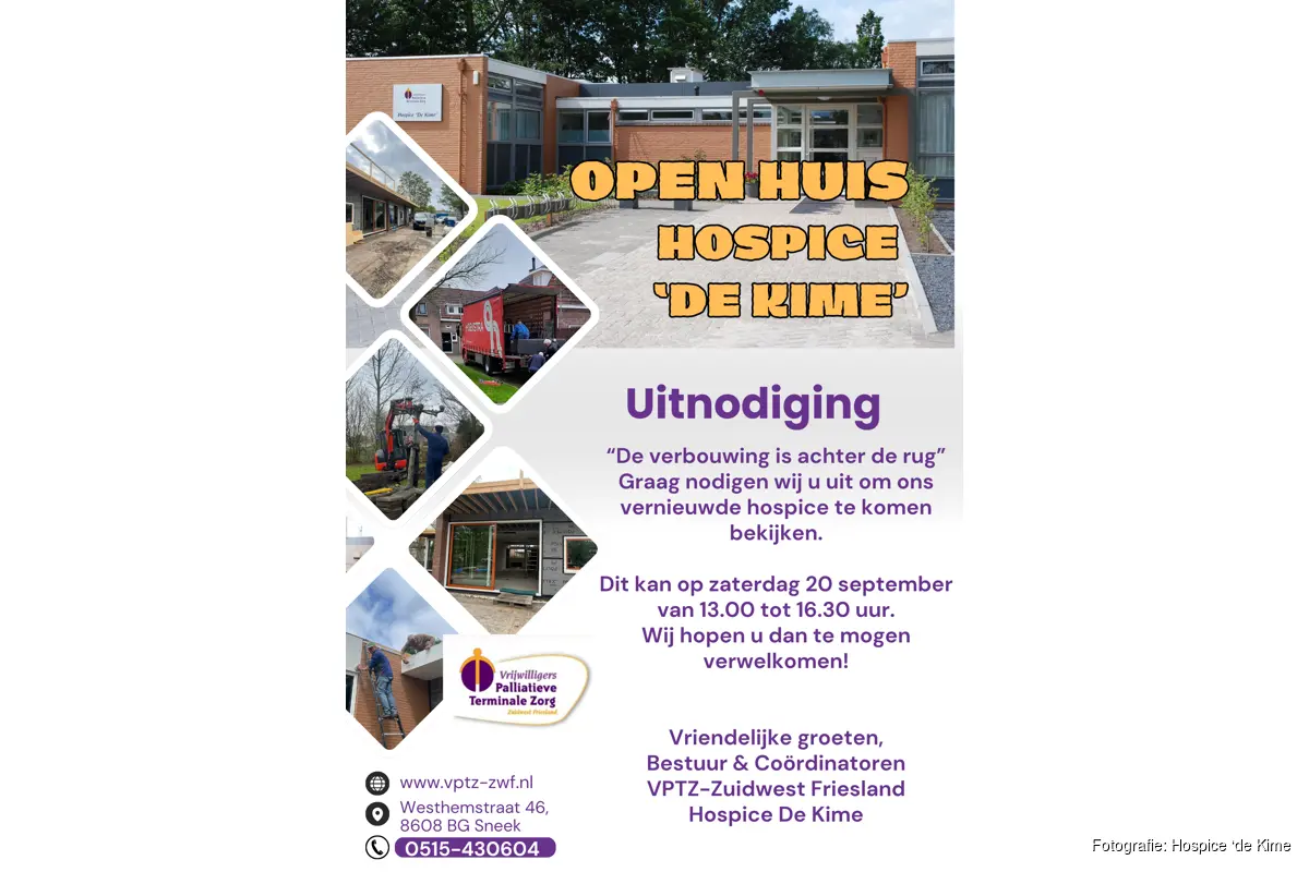 SNEEK - Op vrijdag 19 september 2025 zal wethouder mevr. M Poelman van de gemeente Sùdwest-Fryslân hospice ‘De Kime’ heropenen. Op zaterdag 20 september a.s. is er van 13.00 en 16.30 uur Open Huis zodat belangstellenden een kijkje kunnen nemen in het vernieuwde hospice.